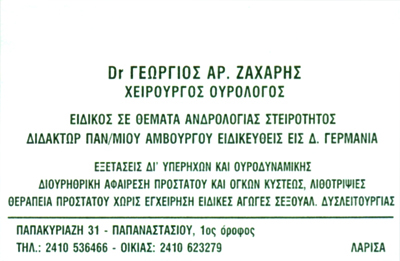 Ο ιατρός ουρολόγος Ζαχαρής Γεώργιος Α Dr στη Λάρισα έλαβε την πλήρη ειδικότητα της χειρουργικής ουρολογίας & ανδρολογίας στη Γερμανία. Το 1983 ανακηρύχθηκε διδάκτορας του Πανεπιστημίου HAMBURG, με διδακτορική διατριβή στον καρκίνο του προστάτη. Έκτοτε, δραστηριοποιείται στη Λάρισα.