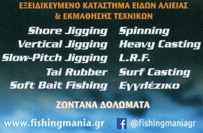 Το Fishing Mania δημιουργήθηκε για τους λάτρεις του ψαρέματος, με πρωταρχικό σκοπότην σωστή εξυπηρέτηση τους, τόσο σε τεχνικά και υλικά θέματα, όσο και στην φιλοξενίατους στον καθαρόαιμο αλιευτικό του χώρο. Σήμερα το Fishingmania, με την δική σας στήριξη,αποτελεί ένα από τα πιο δραστήρια καταστήματα ειδών αλιείας με εξειδίκευση σε κάθε τεχνικήπου εμπλέκονται τεχνητά και όχι μόνο, ενώ πολλά από τα προϊόντα μας τα έχουμε σεαποκλειστικότητα. Κοντά μας ο κάθε ψαράς, αρχάριος ή προχωρημένος θα έχει την δυνατότητανα ανταλλάξει απόψεις και να αποκομίσει γνώσεις για τεχνικές όπως Spinning, Shore Jigging, Egging,Rock Fishing, Surf Casting, Εγγλέζικο, Vertical jigging, Μολύβι Φύλακας, Συρτή, και άλλες τεχνικές.
